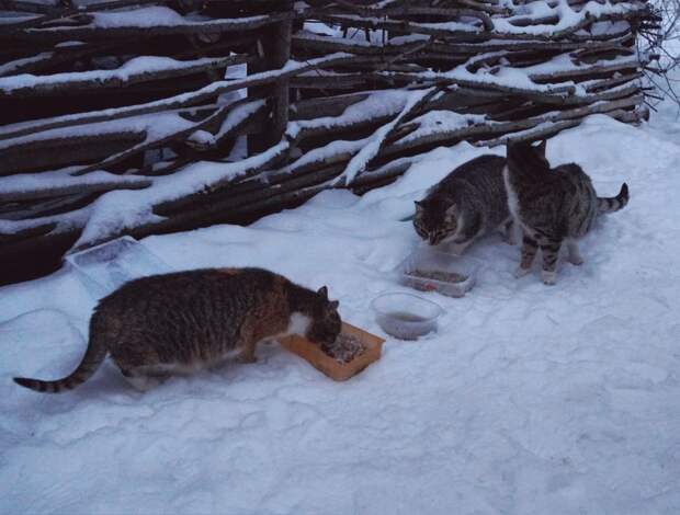 Изредка их приезжает кормить женщина, но этой еды им совершенно не хватает.