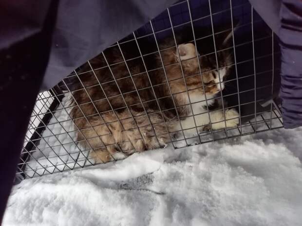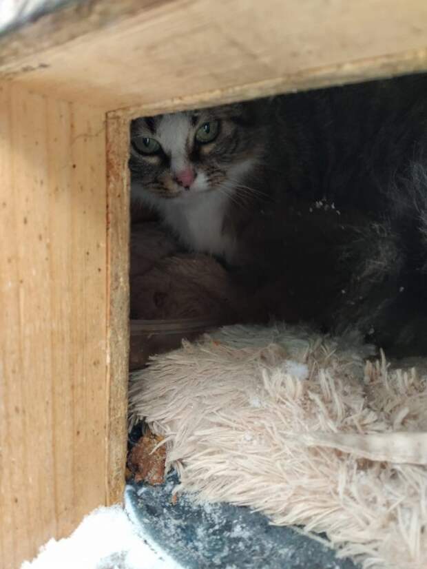 Эта хрупкая и миниатюрная кошечка вынуждена выживать в холод в уличном домике.