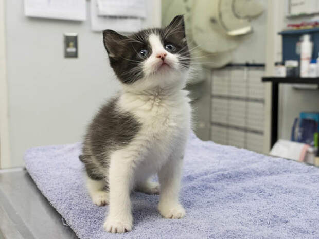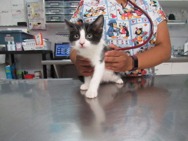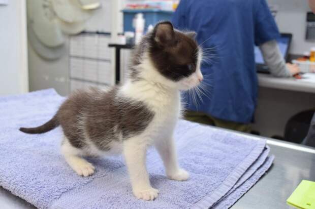 "Котенок был вялым и обезвоженным, но после того как ему ввели много жидкости, сразу приободрился. Он был еще совсем молочным и его надо было кормить из бутылочки и ухаживать за ним круглосуточно. Это оказался мальчик".