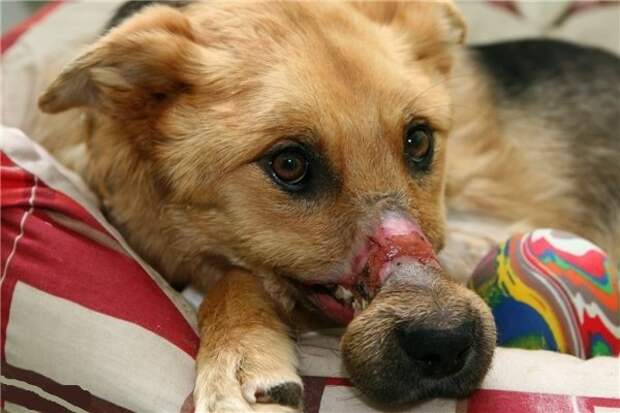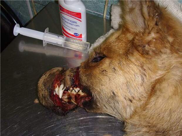 Кто-то, обделенный жизнью и убогий душой, нашел способ выместить свою злобу на том, кто слабее. Он сделал так, что собака, не имевшая возможности сопротивляться и освободиться самостоятельно, на три недели осталась без еды и воды, с изуродованной мордой, в шоковом состоянии. Каким образом она выжила - это первая загадка. Или чудо. Наверное у нее был свой ангел хранитель, потому что ее все-таки нашли, освободили и принесли в клинику. К этому времени шансы на то, чтобы остаться в живых, были близки к нулю.