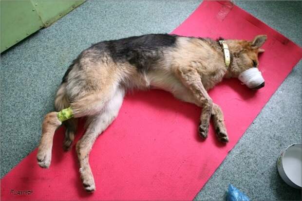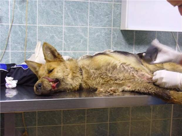 Она ест! И в благодарность пытается махать хвостиком......Врач плачет. Много кормить нельзя, нельзя вызвать рвоту, она просто захлебнется. В следующий раз покормят через 2 часа. Врачи говорят, что собака необыкновенная. При всем, что с ней случилось, она очень доверчивая, она смотрит так, как будто хочет сказать "помоги мне". Тот, кто издевался над этой собакой, может быть удовлетворен, он доставил ей максимум мучений.
