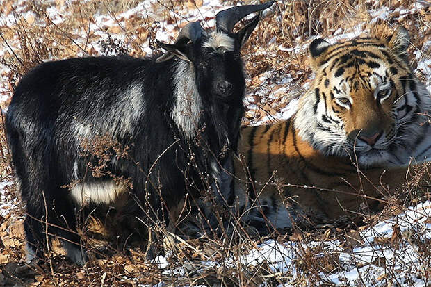 Козлик ответил взаимностью. Обескураженные сотрудники зоопарка нарекли его Тимуром - за отвагу - и поселили новоиспеченных приятелей в одном вольере. Амур маленького друга трепетно берег: на ночь уступал свой лежак, спал на крыше.Когда похолодало и повалил снег, тигра отселили в отдельную «квартиру». Но по утрам друзей выпускают, тигр и козел вместе гуляют до темноты. На сайте зверинца рогато-полосатая мелодрама идет в режиме он-лайн: директор Дмитрий Мезенцев каждый день выкладывает новую порцию фото и видео.