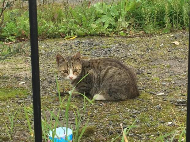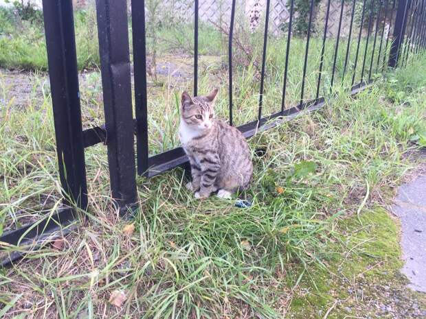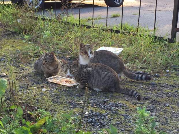Эти трое котят-подростков поселились на парковке в Петербурге. Ничем не приметные полосатики. У одного - больной глазик.