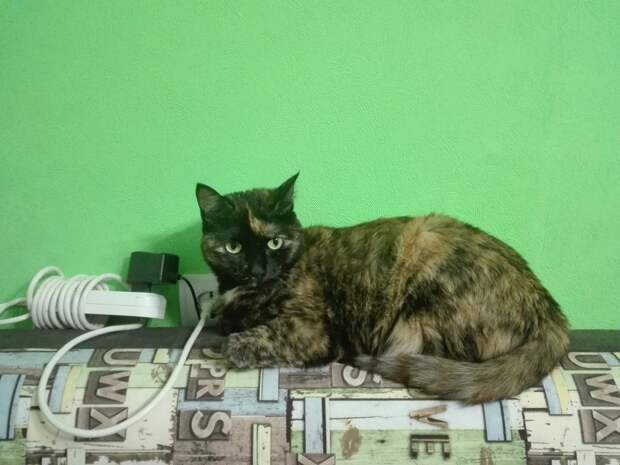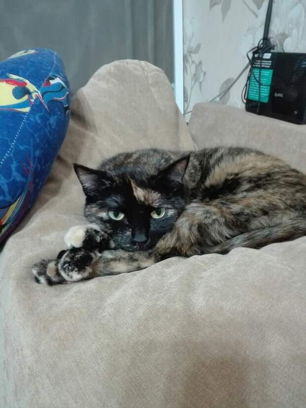 Через два года взяли кошечку. Уже большенькую. Забрали с передержи, с ужасных условий. Невероятной ласковости кошечка. Только погладь или возьми на ручки — мурчалка тарахтеть начинает.