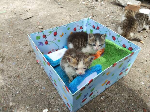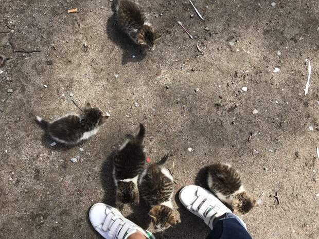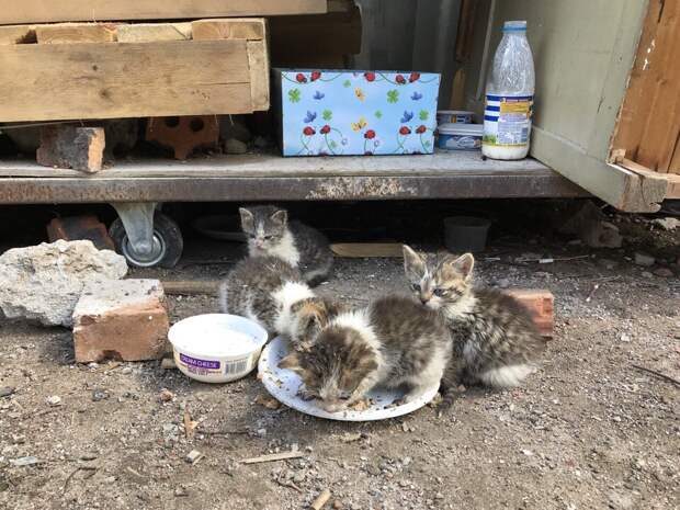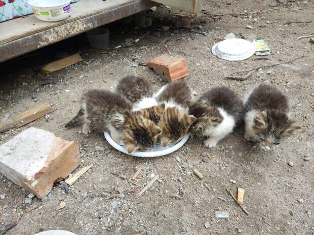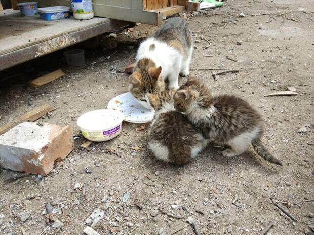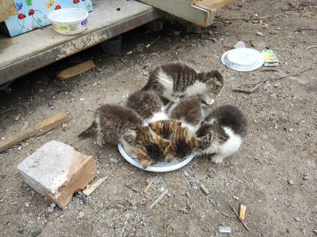 На улице оказались 6 лапочек, ещё совсем маленьких, беззащитных, но очень красивых котят. Кушают уже сами.