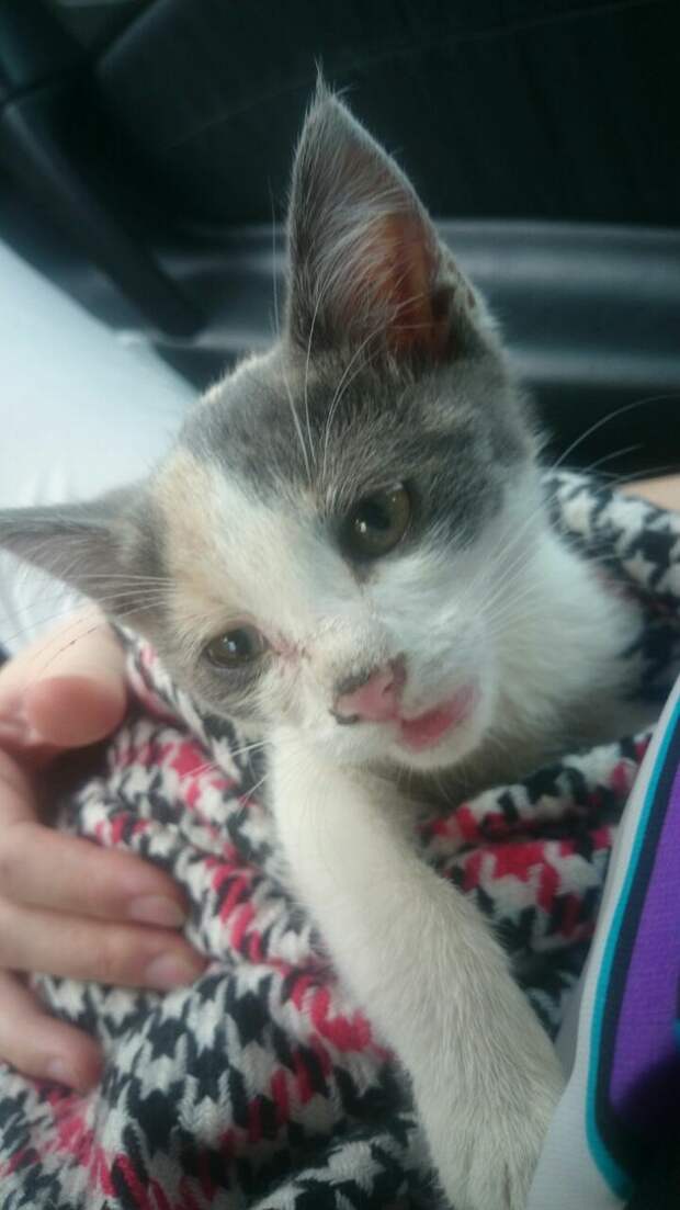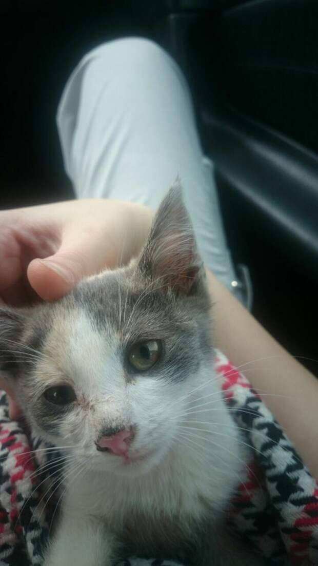 Ездили из города в город. Остановились у городской администрации, где к нам практически подползло вот это чудо с хрипячишим мяуканием в поисках еды.