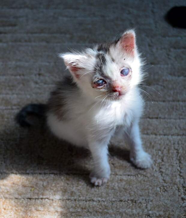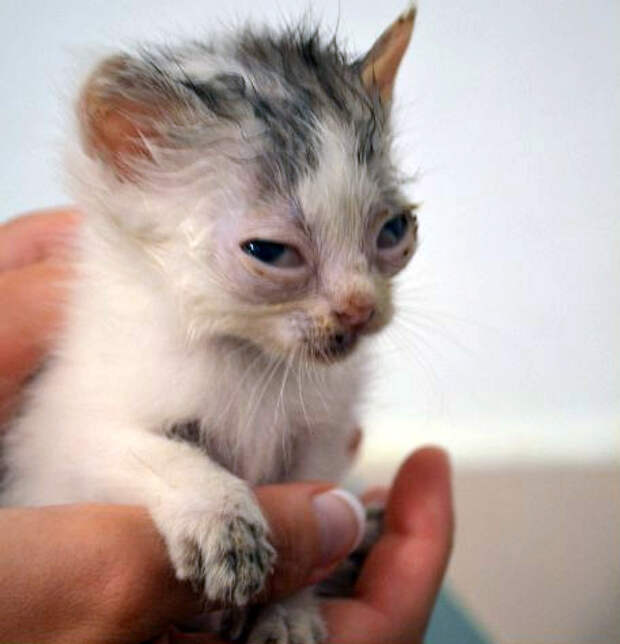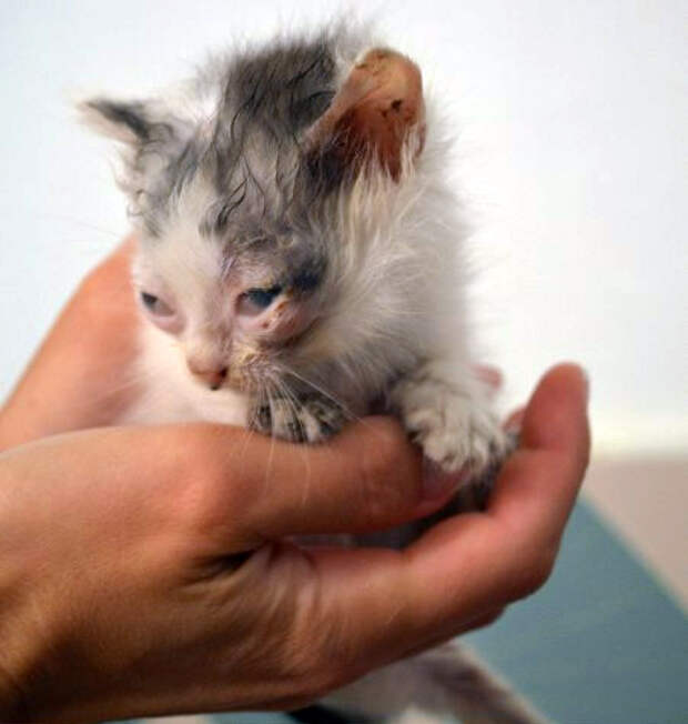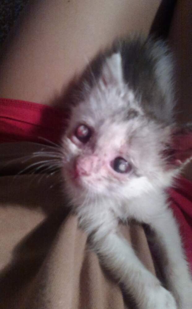 Вглядевшись, мы увидели истощённого и усеянного паразитами крошечного котёнка с воспалёнными гноящимися глазками.