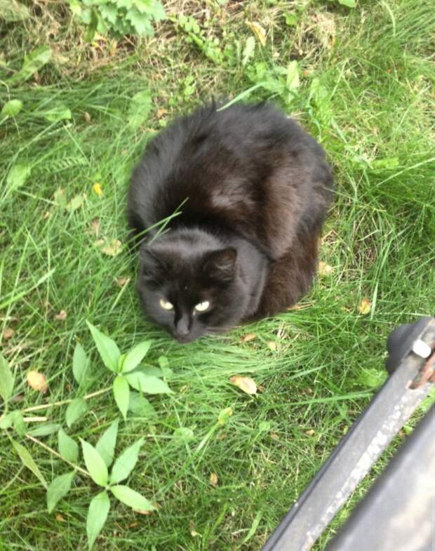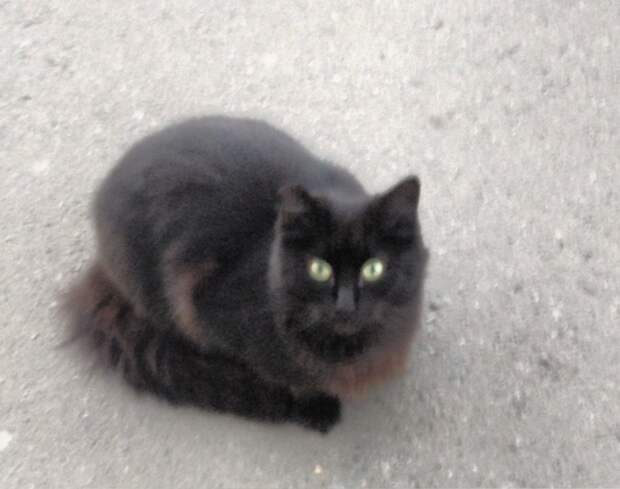Миниатюрная чёрная с шоколадным отливом пушистая кошечка вот уже больше года ежедневно приходит к магазину. Покорно сидит у дверей магазина, будто собачка, с надеждой заглядывая в глаза выходящим из дверей людям, словно ищет и ждёт кого-то. Но все равнодушно проходят мимо.