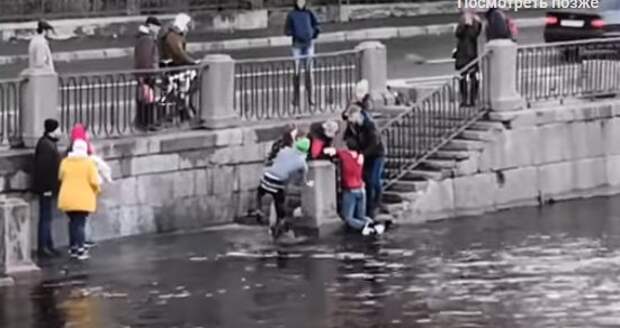 В Петербурге стоит уже достаточно прохладная погода, но тем ни менее муж хозяйки Булочки, поняв, что собака в серьезной опасности, скинул верхнюю одежду и прыгнул в воду для ее спасения.