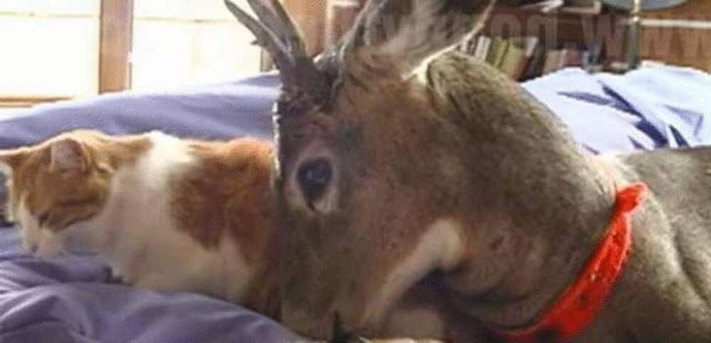 Заботливая кошка заменила одинокому маленькому олененку маму